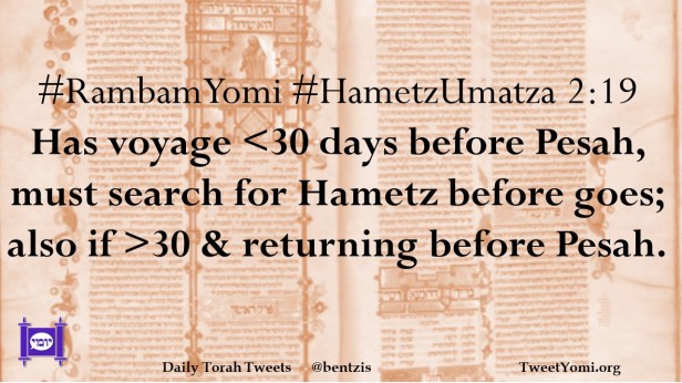 #RambamYomi #HametzUmatza 2:19 Has voyage <30 days before Pesah, must search for Hametz before goes; also if >30 & returning before Pesah.