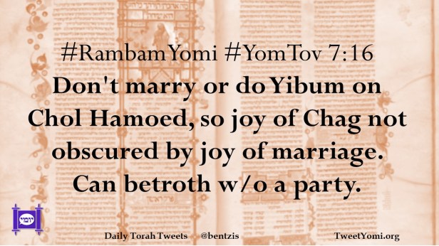 #RambamYomi #YomTov 7:16 Don’t marry or do Yibum on Chol Hamoed, so joy of Chag not obscured by joy of marriage. Can betroth w/o a party.