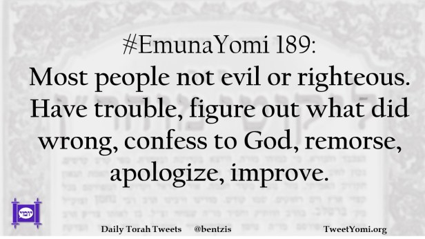 #EmunaYomi 189: Most people not evil or righteous. Have trouble, figure out what did wrong, confess to God, remorse, apologize, improve.
