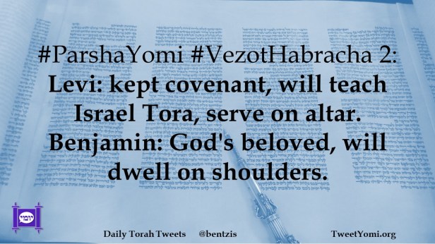 #ParshaYomi #VezotHabracha 2: Levi: kept covenant, will teach Israel Tora, serve on altar. Benjamin: God’s beloved, will dwell on shoulders.