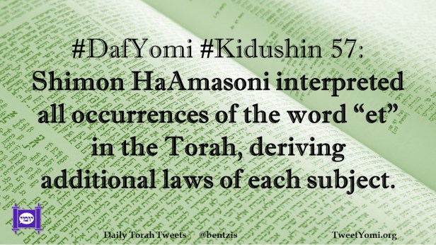 DafYomi, Kidushin #DafYomi #Kidushin 57 Date: October 11, 2023Author: netanelspitz #DafYomi #Kidushin 57: Shimon HaAmasoni interpreted all occurrences of the word “et” in the Torah, deriving additional laws of each subject. Share this: Share on X (Opens in new window) X Share on Facebook (Opens in new window) Facebook Like Loading... Related