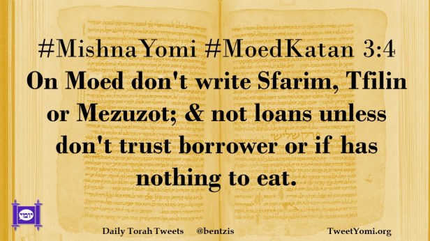 #MishnaYomi #MoedKatan 3:4 On Moed don’t write Sfarim, Tfilin or Mezuzot; & not loans unless don’t trust borrower or if has nothing to eat.