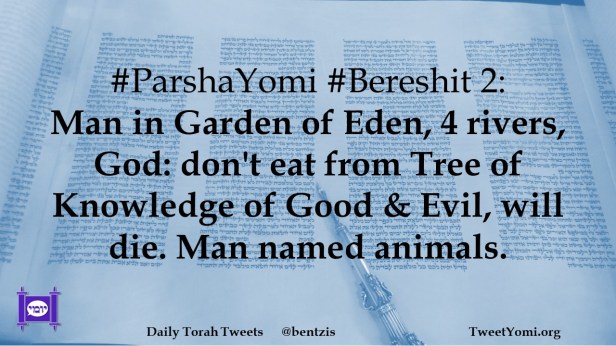 #ParshaYomi #Bereshit 2: Man in Garden of Eden, 4 rivers, God: don’t eat from Tree of Knowledge of Good & Evil, will die. Man named animals.