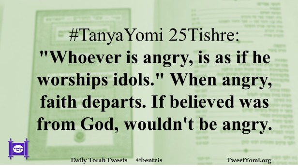 #TanyaYomi 25Tishre: “Whoever is angry, is as if he worships idols.” When angry, faith departs. If believed was from God, wouldn’t be angry.