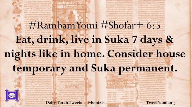RambamYomi, Shofar+ #RambamYomi #Shofar+ 6:5 Date: October 12, 2023Author: netanelspitz #RambamYomi #Shofar+ 6:5 Eat, drink, live in Suka 7 days & nights like in home. Consider house temporary and Suka permanent. Share this: Share on X (Opens in new window) X Share on Facebook (Opens in new window) Facebook Like Loading... Related