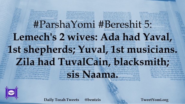 #ParshaYomi #Bereshit 5: Lemech’s 2 wives: Ada had Yaval, 1st shepherds; Yuval, 1st musicians. Zila had TuvalCain, blacksmith; sis Naama.