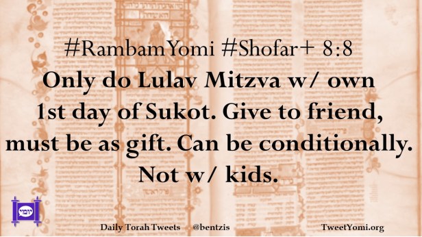 #RambamYomi #Shofar+ 8:8 Only do Lulav Mitzva w/ own 1st day of Sukot. Give to friend, must be as gift. Can be conditionally. Not w/ kids.