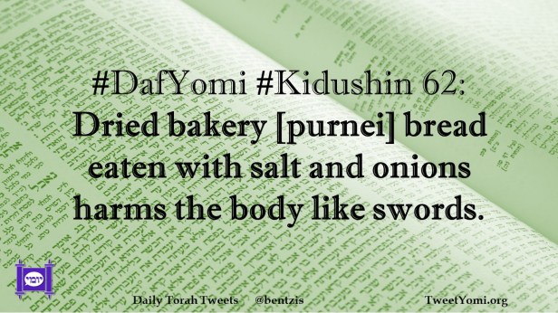 DafYomi, Kidushin #DafYomi #Kidushin 62 Date: October 17, 2023Author: netanelspitz #DafYomi #Kidushin 62: Dried bakery [purnei] bread eaten with salt and onions harms the body like swords. Share this: Share on X (Opens in new window) X Share on Facebook (Opens in new window) Facebook Like Loading... Related