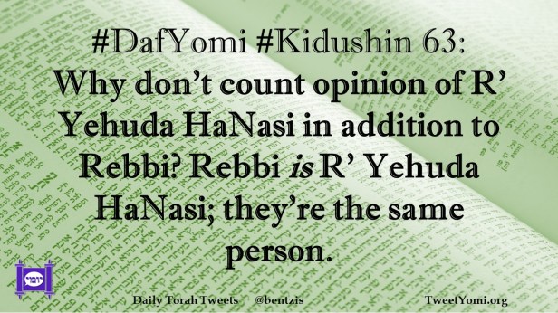 DafYomi, Kidushin #DafYomi #Kidushin 63 Date: October 17, 2023Author: netanelspitz #DafYomi #Kidushin 63: Why don’t count opinion of R’ Yehuda HaNasi in addition to Rebbi? Rebbi is R’ Yehuda HaNasi; they’re the same person. Share this: Share on X (Opens in new window) X Share on Facebook (Opens in new window) Facebook Like Loading... Related