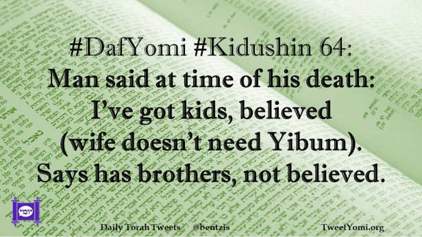 DafYomi, Kidushin #DafYomi #Kidushin 64 Date: October 17, 2023Author: netanelspitz #DafYomi #Kidushin 64: Man said at time of his death: I’ve got kids, believed (wife doesn’t need Yibum). Says has brothers, not believed. Share this: Share on X (Opens in new window) X Share on Facebook (Opens in new window) Facebook Like Loading... Related