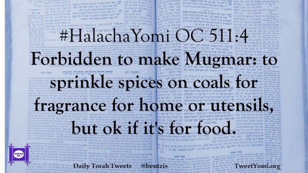 #HalachaYomi OC 511:4 Forbidden to make Mugmar: to sprinkle spices on coals for fragrance for home or utensils, but ok if it’s for food.