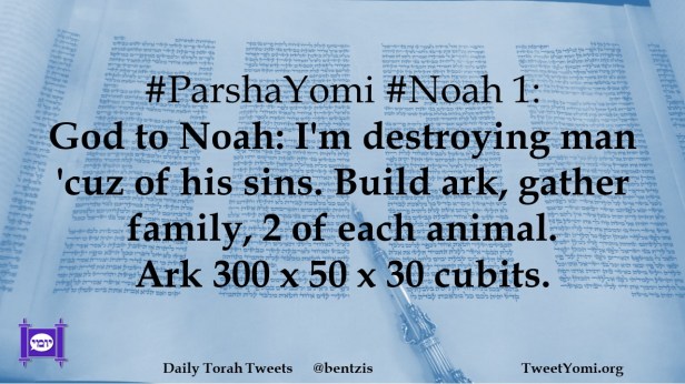 #ParshaYomi #Noah 1: God to Noah: I’m destroying man ‘cuz of his sins. Build ark, gather family, 2 of each animal. Ark 300 x 50 x 30 cubits.