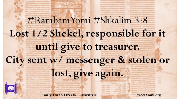 #RambamYomi #Shkalim 3:8 Lost 1/2 Shekel, responsible for it until give to treasurer. City sent w/ messenger & stolen or lost, give again.