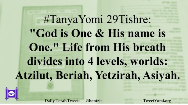 #TanyaYomi 29Tishre: “God is One & His name is One.” Life from His breath divides into 4 levels, worlds: Atzilut, Beriah, Yetzirah, Asiyah.