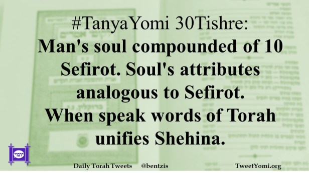 #TanyaYomi 30Tishre: Man’s soul compounded of 10 Sefirot. Soul’s attributes analogous to Sefirot. When speak words of Torah unifies Shehina.