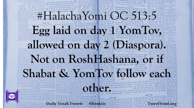 #HalachaYomi OC 513:5 Egg laid on day 1 YomTov, allowed on day 2 (Diaspora). Not on RoshHashana, or if Shabat & YomTov follow each other.