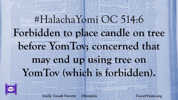 #HalachaYomi OC 514:6 Forbidden to place candle on tree before YomTov; concerned that may end up using tree on YomTov (which is forbidden).