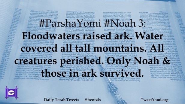 #ParshaYomi #Noah 3: Floodwaters raised ark. Water covered all tall mountains. All creatures perished. Only Noah & those in ark survived.