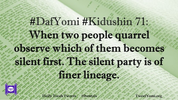 DafYomi, Kidushin #DafYomi #Kidushin 71 Date: October 24, 2023Author: netanelspitz #DafYomi #Kidushin 71: When two people quarrel observe which of them becomes silent first. The silent party is of finer lineage. Share this: Share on X (Opens in new window) X Share on Facebook (Opens in new window) Facebook Like Loading... Related