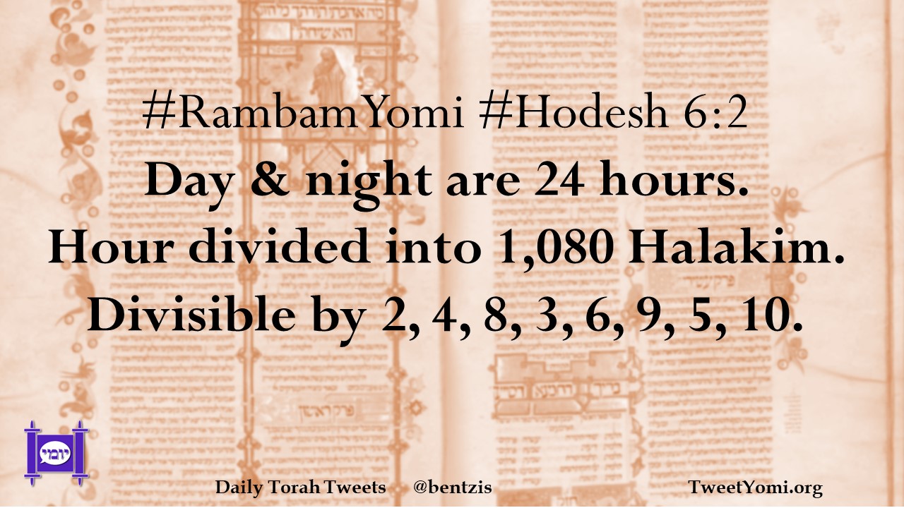 Hodesh, RambamYomi #RambamYomi #Hodesh 6:2 Date: October 24, 2023Author: netanelspitz #RambamYomi #Hodesh 6:2 Day & night are 24 hours. Hour divided into 1,080 Halakim. Divisible by 2, 4, 8, 3, 6, 9, 5, 10. Share this: Share on X (Opens in new window) X Share on Facebook (Opens in new window) Facebook Like Loading... Related