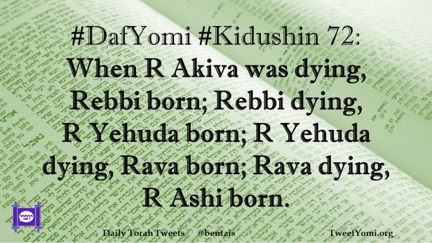 DafYomi, Kidushin #DafYomi #Kidushin 72 Date: October 29, 2023Author: netanelspitz #DafYomi #Kidushin 72: When R Akiva was dying, Rebbi born; Rebbi dying, R Yehuda born; R Yehuda dying, Rava born; Rava dying, R Ashi born. Share this: Share on X (Opens in new window) X Share on Facebook (Opens in new window) Facebook Like Loading... Related