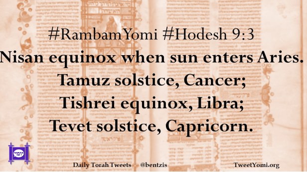 #RambamYomi #Hodesh 9:3 Nisan equinox when sun enters Aries. Tamuz solstice, Cancer; Tishrei equinox, Libra; Tevet solstice, Capricorn.