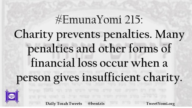 #EmunaYomi 215: Charity prevents penalties. Many penalties and other forms of financial loss occur when a person gives insufficient charity.