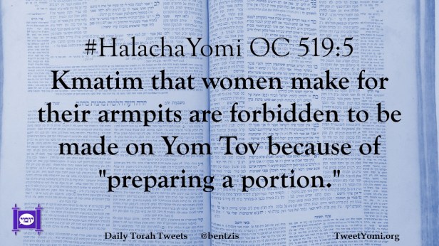 #HalachaYomi OC 519:5 Kmatim that women make for their armpits are forbidden to be made on Yom Tov because of “preparing a portion.”