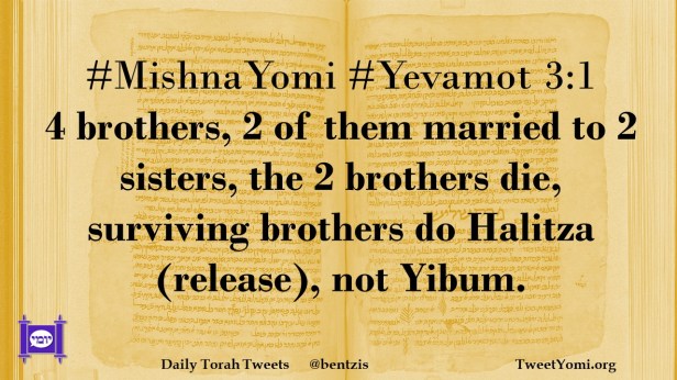 #MishnaYomi #Yevamot 3:1 4 brothers, 2 of them married to 2 sisters, the 2 brothers die, surviving brothers do Halitza (release), not Yibum.