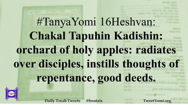 #TanyaYomi 16Heshvan: Chakal Tapuhin Kadishin: orchard of holy apples: radiates over disciples, instills thoughts of repentance, good deeds.