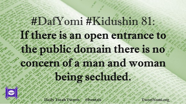 DafYomi, Kidushin #DafYomi #Kidushin 81 Date: November 9, 2023Author: netanelspitz #DafYomi #Kidushin 81: If there is an open entrance to the public domain there is no concern of a man and woman being secluded. Share this: Share on X (Opens in new window) X Share on Facebook (Opens in new window) Facebook Like Loading... Related