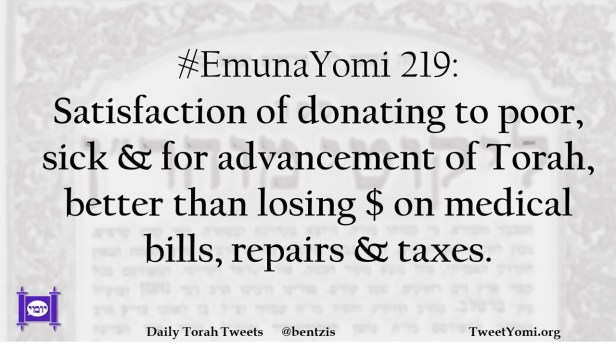 #EmunaYomi 219: Satisfaction of donating to poor, sick & for advancement of Torah, better than losing $ on medical bills, repairs & taxes.
