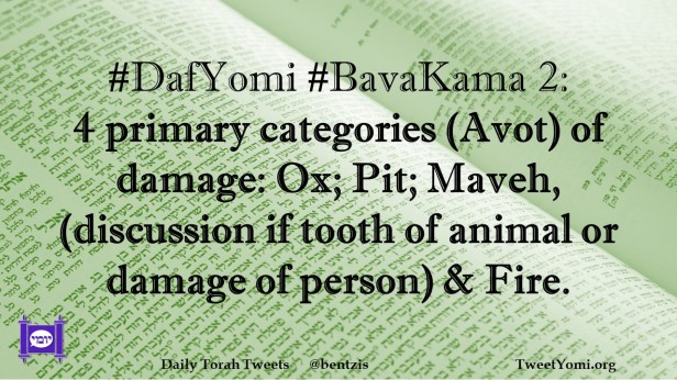 BavaKama, DafYomi #DafYomi #BavaKama 2 Date: November 12, 2023Author: netanelspitz #DafYomi #BavaKama 2: 4 primary categories (Avot) of damage: Ox; Pit; Maveh, (discussion if tooth of animal or damage of person) & Fire. Share this: Share on X (Opens in new window) X Share on Facebook (Opens in new window) Facebook Like Loading... Related