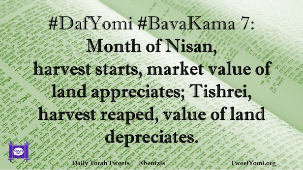 BavaKama, DafYomi #DafYomi #BavaKama 7 Date: November 12, 2023Author: netanelspitz #DafYomi #BavaKama 7: Month of Nisan, harvest starts, market value of land appreciates; Tishrei, harvest reaped, value of land depreciates. Share this: Share on X (Opens in new window) X Share on Facebook (Opens in new window) Facebook Like Loading... Related