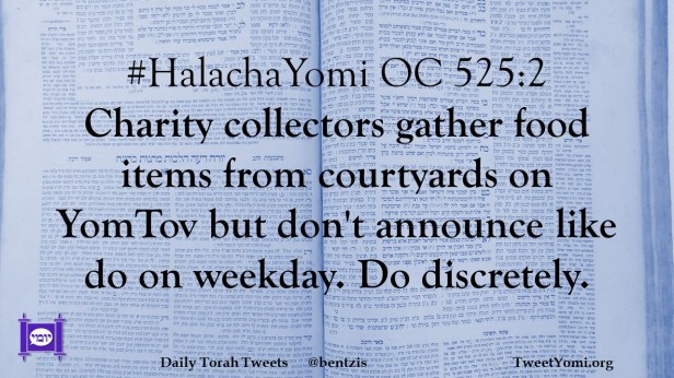 #HalachaYomi OC 525:2 Charity collectors gather food items from courtyards on YomTov but don’t announce like do on weekday. Do discretely.