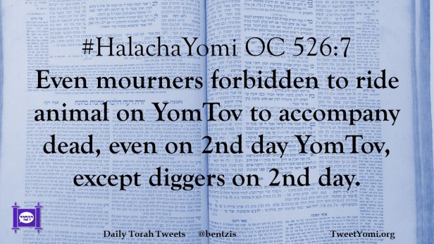 #HalachaYomi OC 526:7 Even mourners forbidden to ride animal on YomTov to accompany dead, even on 2nd day YomTov, except diggers on 2nd day.