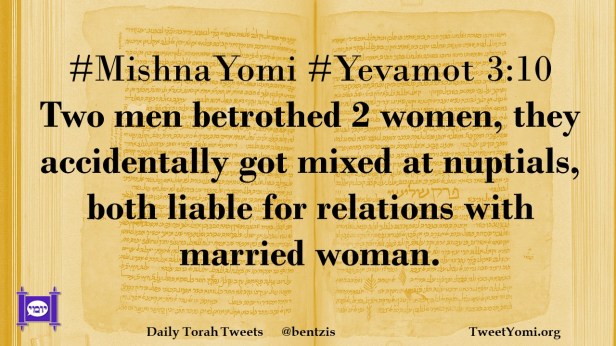 #MishnaYomi #Yevamot 3:10 Two men betrothed 2 women, they accidentally got mixed at nuptials, both liable for relations with married woman.