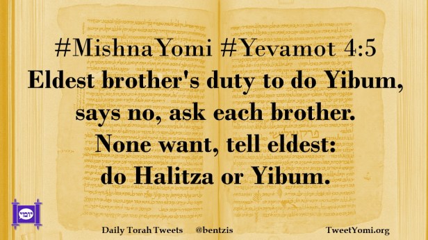 #MishnaYomi #Yevamot 4:5 Eldest brother’s duty to do Yibum, says no, ask each brother. None want, tell eldest: do Halitza or Yibum.