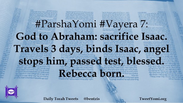 #ParshaYomi #Vayera 7: God to Abraham: sacrifice Isaac. Travels 3 days, binds Isaac, angel stops him, passed test, blessed. Rebecca born.