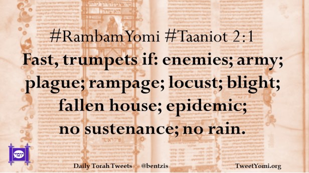 #RambamYomi #Taaniot 2:1 Fast, trumpets if: enemies; army; plague; rampage; locust; blight; fallen house; epidemic; no sustenance; no rain.