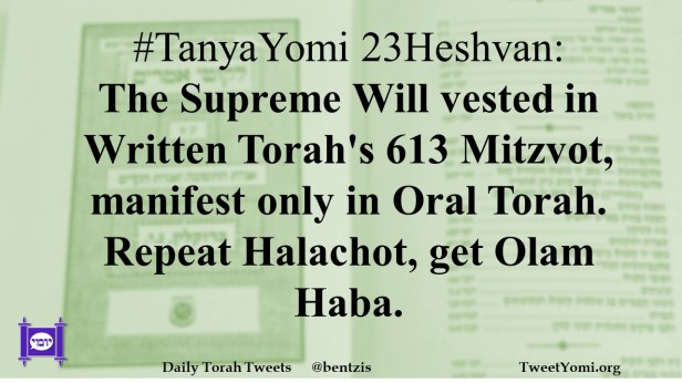 #TanyaYomi 23Heshvan: The Supreme Will vested in Written Torah’s 613 Mitzvot, manifest only in Oral Torah. Repeat Halachot, get Olam Haba.