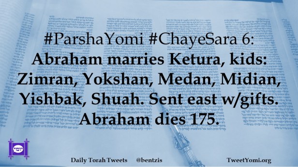 #ParshaYomi #ChayeSara 6: Abraham marries Ketura, kids: Zimran, Yokshan, Medan, Midian, Yishbak, Shuah. Sent east w/gifts. Abraham dies 175.