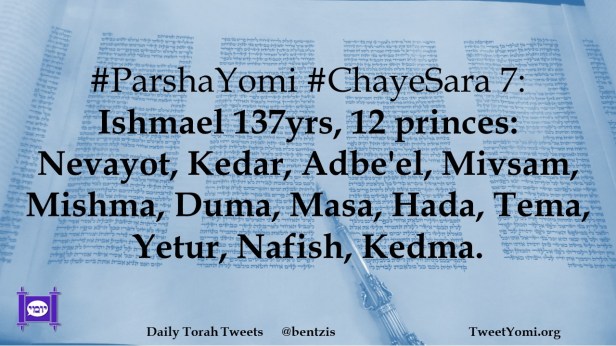 #ParshaYomi #ChayeSara 7: Ishmael 137yrs, 12 princes: Nevayot, Kedar, Adbe’el, Mivsam, Mishma, Duma, Masa, Hada, Tema, Yetur, Nafish, Kedma.
