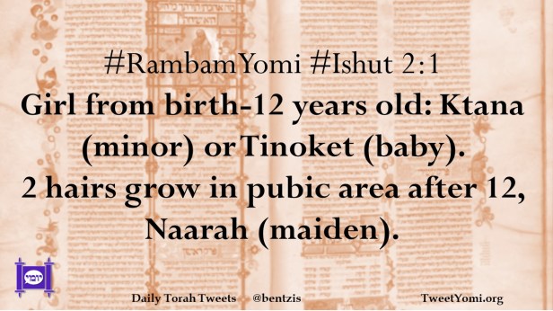 #RambamYomi #Ishut 2:1 Girl from birth-12 years old: Ktana (minor) or Tinoket (baby). 2 hairs grow in pubic area after 12, Naarah (maiden).
