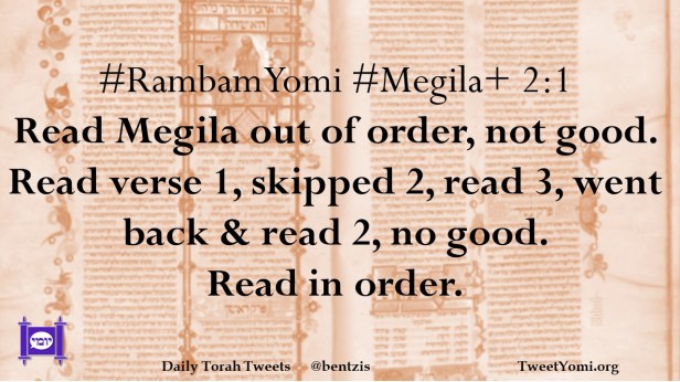 #RambamYomi #Megila+ 2:1 Read Megila out of order, not good. Read verse 1, skipped 2, read 3, went back & read 2, no good. Read in order.