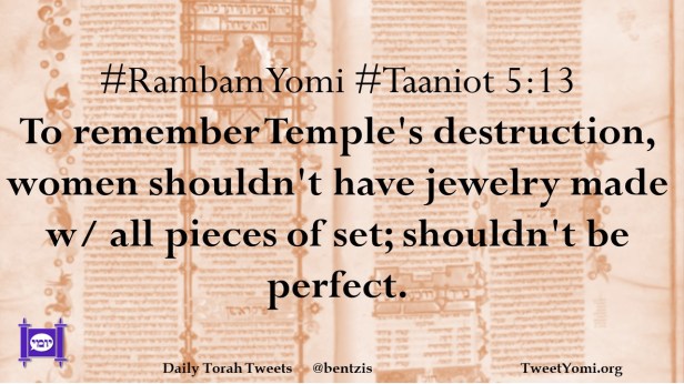 #RambamYomi #Taaniot 5:13 To remember Temple’s destruction, women shouldn’t have jewelry made w/ all pieces of set; shouldn’t be perfect.