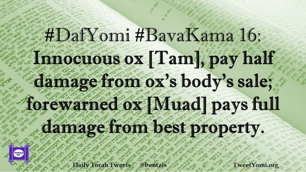 BavaKama, DafYomi #DafYomi #BavaKama 16 Date: November 23, 2023Author: netanelspitz #DafYomi #BavaKama 16: Innocuous ox [Tam], pay half damage from ox’s body’s sale; forewarned ox [Muad] pays full damage from best property. Share this: Share on X (Opens in new window) X Share on Facebook (Opens in new window) Facebook Like Loading... Related