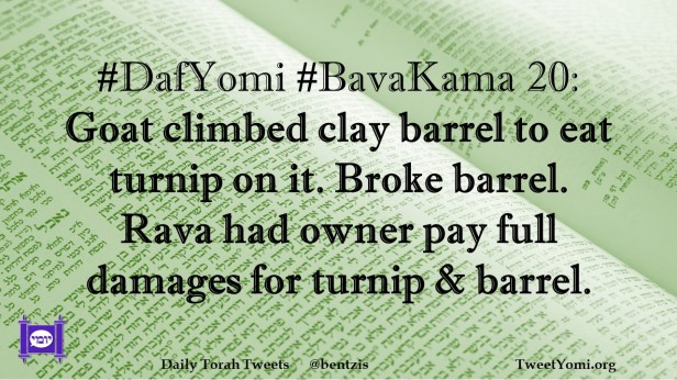 BavaKama, DafYomi #DafYomi #BavaKama 20 Date: November 23, 2023Author: netanelspitz #DafYomi #BavaKama 20: Goat climbed clay barrel to eat turnip on it. Broke barrel. Rava had owner pay full damages for turnip & barrel. Share this: Share on X (Opens in new window) X Share on Facebook (Opens in new window) Facebook Like Loading... Related
