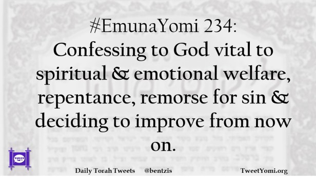 #EmunaYomi 234: Confessing to God vital to spiritual & emotional welfare, repentance, remorse for sin & deciding to improve from now on.
