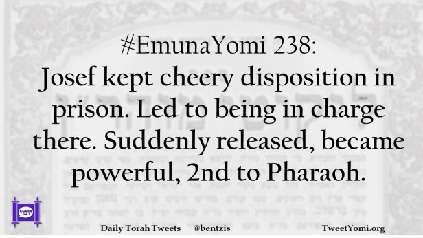 #EmunaYomi 238: Josef kept cheery disposition in prison. Led to being in charge there. Suddenly released, became powerful, 2nd to Pharaoh.